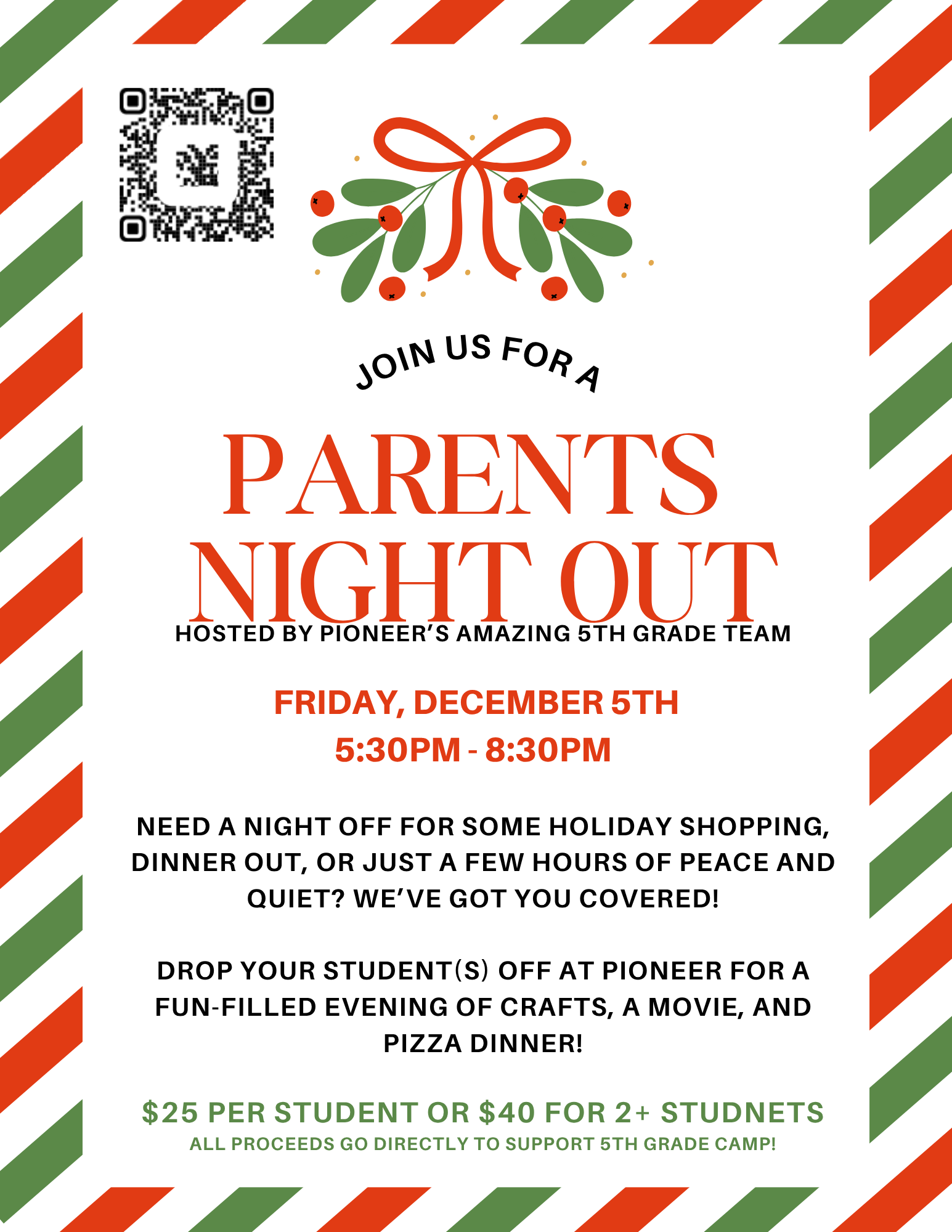 Our amazing 5th grade team is hosting a fundraiser to help support 5th Grade Camp. Need a night off for holiday shopping, a quiet dinner out, or simply a few hours to yourself? We’ve got you covered!